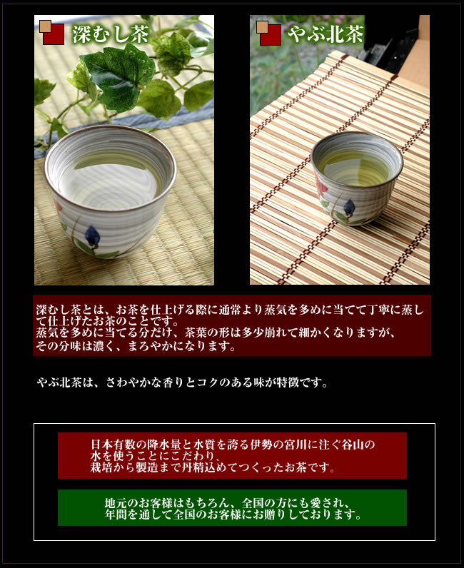 | 昔ながらの普通蒸し煎茶・やぶ北茶と、深蒸し煎茶・深むし茶のセットです。 普通蒸し煎茶は、黄金色に出ますが、深蒸し煎茶は、深緑色に出ます。 賞味期限:商品発送日より1年間。包装してお届け致します。 |