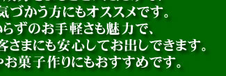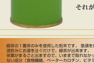 お茶缶から「サッとひと振りすぐおいしい」それがいちばんの新しい粉末茶スタイル お茶缶に粉末茶の振り出し口を空けました。 緑茶の1番茶のみを使用した粉末です。 急須を使用せず、湯飲みにお湯を注ぐだけで、緑茶が出来ます。 茶葉がまるごと出ますので、いままで取れなかった水に溶けない成分 (食物繊維、ベーターカロチン、ビタミンE、クロロフィル)が お茶と一緒に取る事が出来ます。このお茶は粉末にする機械を導入し、自社製造しています。 *お好みにより、濃さを調整してお楽しみ下さい。 |